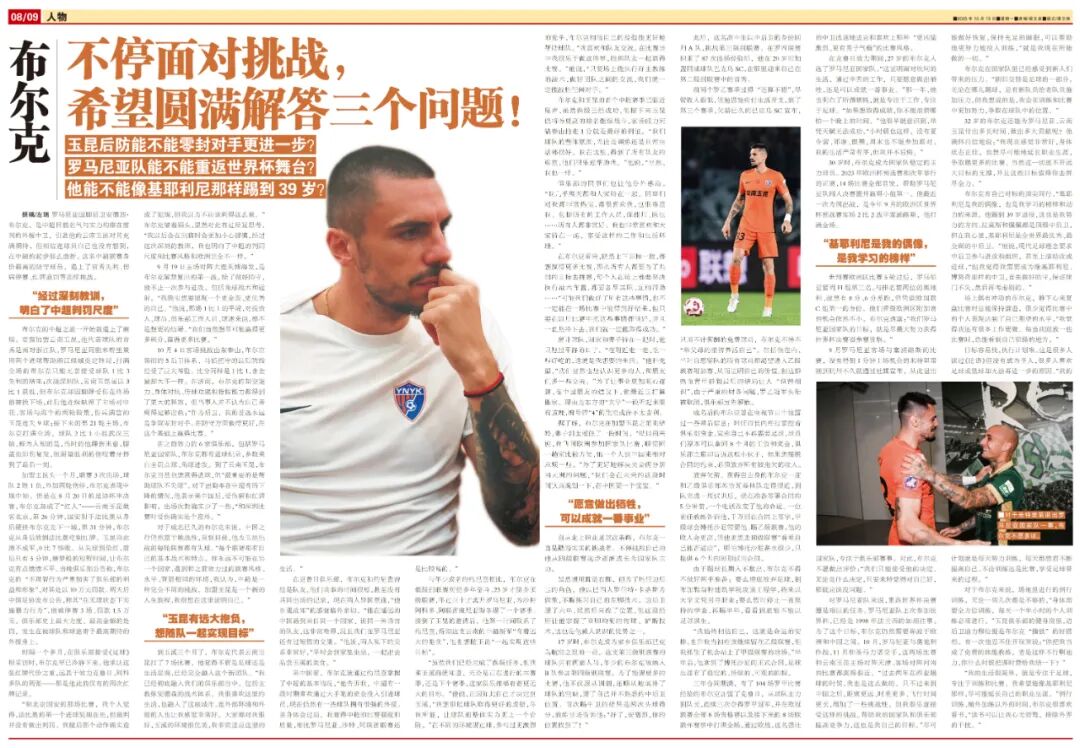对罗马尼亚队来说,重返世界杯决赛圈是艰巨的任务。罗马尼亚队上次参加世界杯,已经是1998年法兰西的如烟往事。为了这个目标,布尔克仍然需要奔波于欧洲和中国之间。10月罗马尼亚战罢奥地利,11月将与圣马力诺交手,这两场比赛和云南玉昆主场对阵天津、客场对阵河南的比赛都离得很近。“过去两年在西亚踢球的时候,我也是这么做的。只不过来到中国之后,距离更远、时差更多、飞行时间更长,增加了一些挑战性。但我很乐意接受这样的挑战。帮助我的国家队和俱乐部提高竞争力,这也是我自己的目标。”尽可能做好恢复,保持充足的睡眠,可以帮助他更努力地投入训练,“就是我现在所能做的一切。”