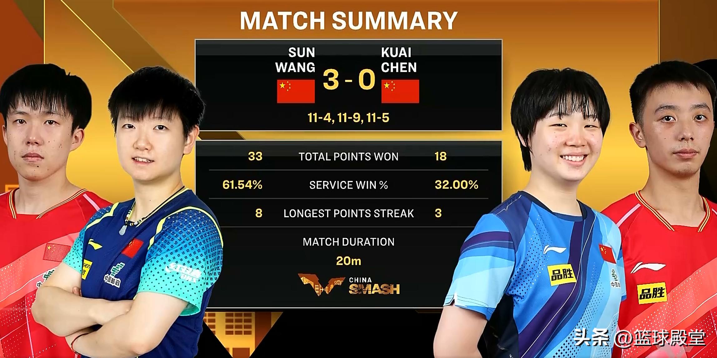这场比赛来看,王楚钦/孙颖莎就是实力上的压制。一方面他们两个配合非常久,还有一方面个人技术方面就是保持压制。就整个过程来看,打得还是太顺利了。可能第二局比分看起来激烈,只要及时调整,他们还是可以轻松完成逆转,全场比赛就打了20分钟。从目前的状态发挥来说,王楚钦/孙颖莎肯定会冲刺最后的冠军。